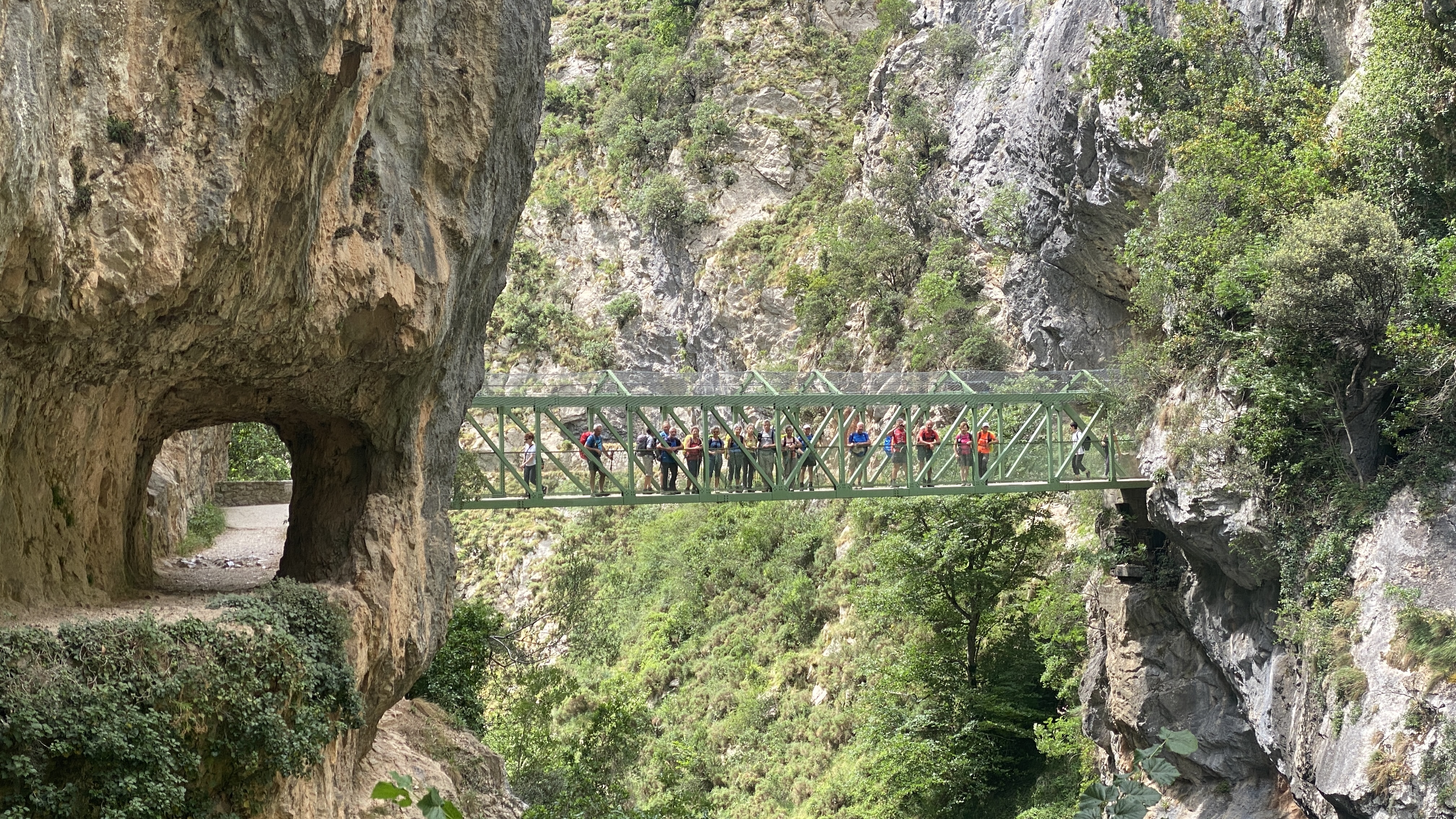 La troupe s’engage sur le chemin qui a été aménagé pour réaliser puis entretenir le canal d’amenée d’eau à l’usine hydroélectrique de Poncebos. Nous remonterons ce bon chemin durant 12 kms jusqu’à la prise d’eau dans le río Cares.